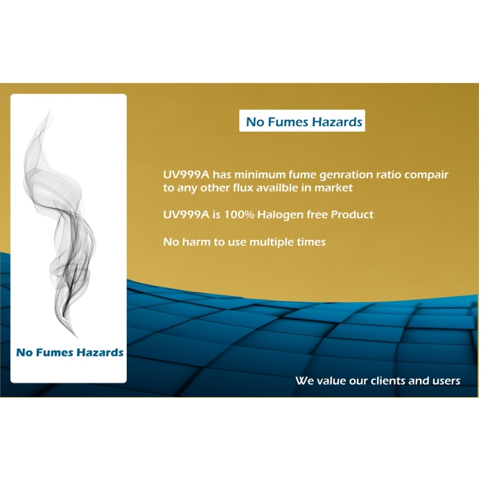 14. Suitable for Metal reworking. No Fumes Hazards: UV999A has a minimum fume generation ratio compared to any other flux available in the market. UV999A is a 100% Halogen-free Product. No harm in using it multiple times.
