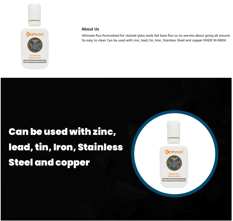 Ultimate flux formulated for stained glass work Gel base flux so no worries about going all around So easy to clean Can be used with zinc, lead, tin, Iron, Stainless Steel and copper MADE IN INDIA