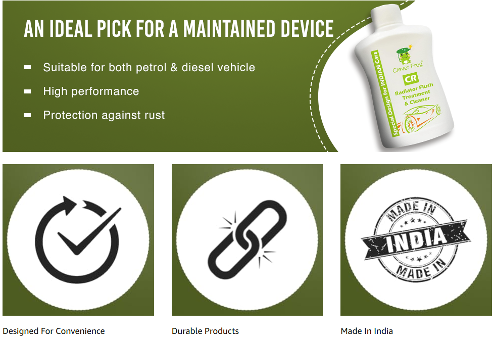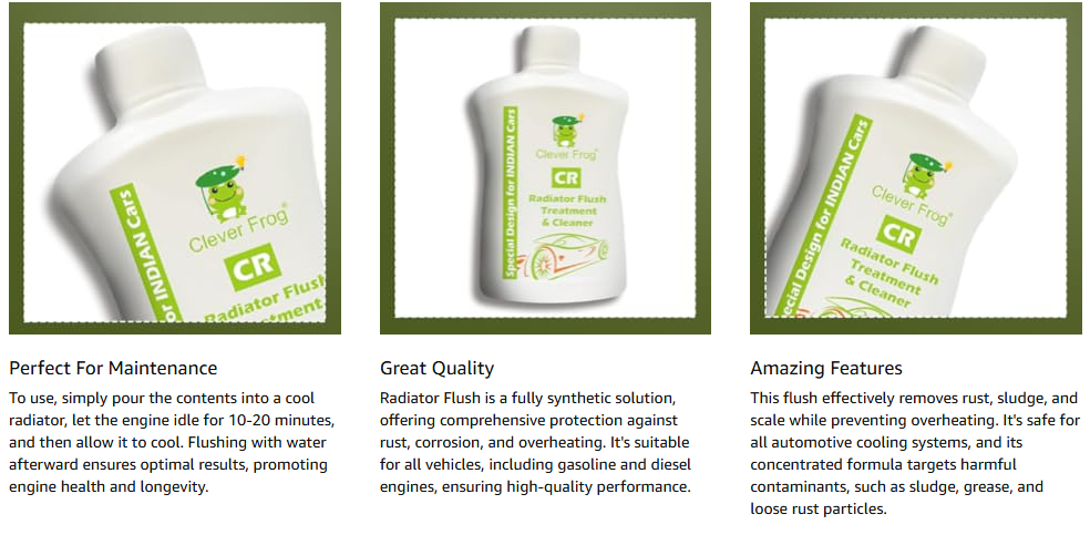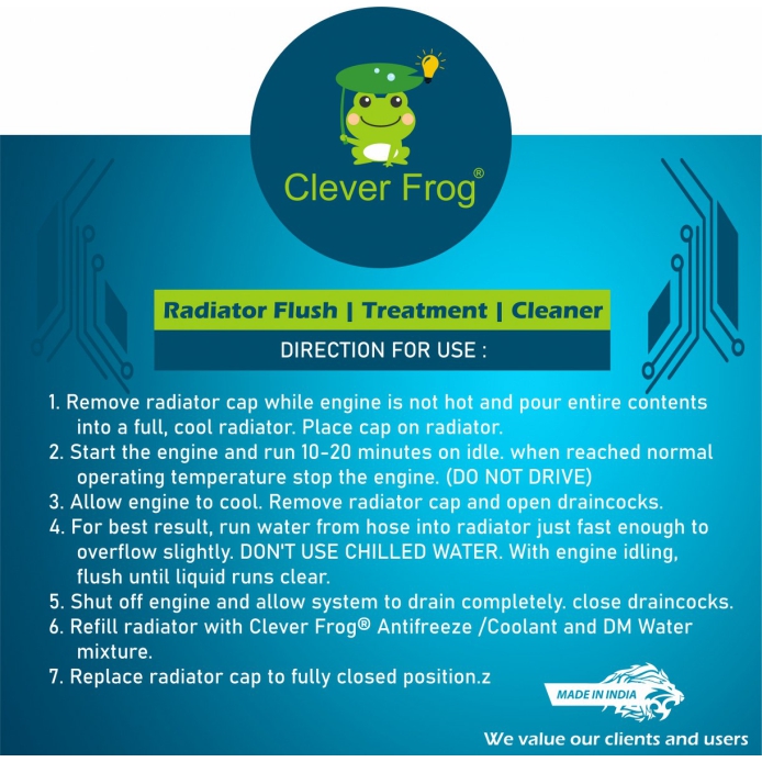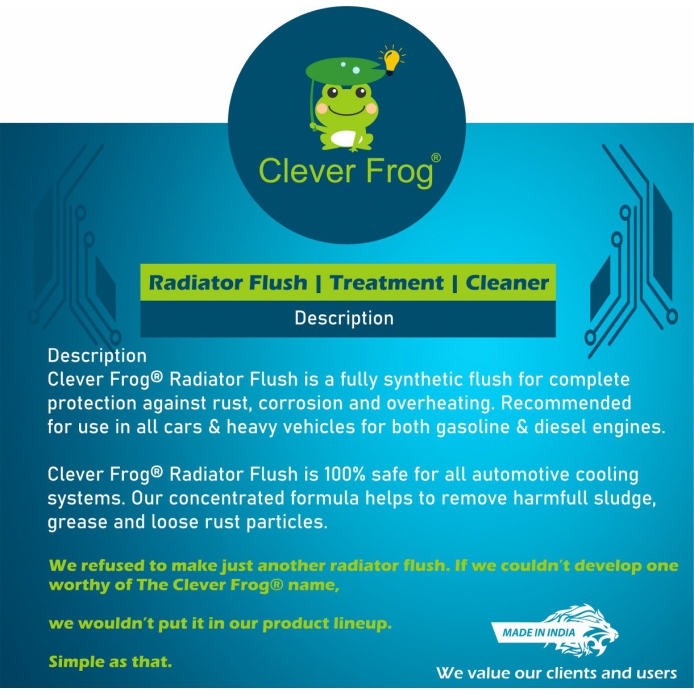 Clever Frog® Radiator Flush is a fully synthetic flush for complete protection against rust, corrosion and overheating. Recommended for use in all cars & heavy vehicles for both gasoline & diesel engines. Clever Frog® Radiator Flush is 100% safe for all automotive cooling systems. Our concentrated formula helps to remove harmfull sludge, grease and loose rust particles.