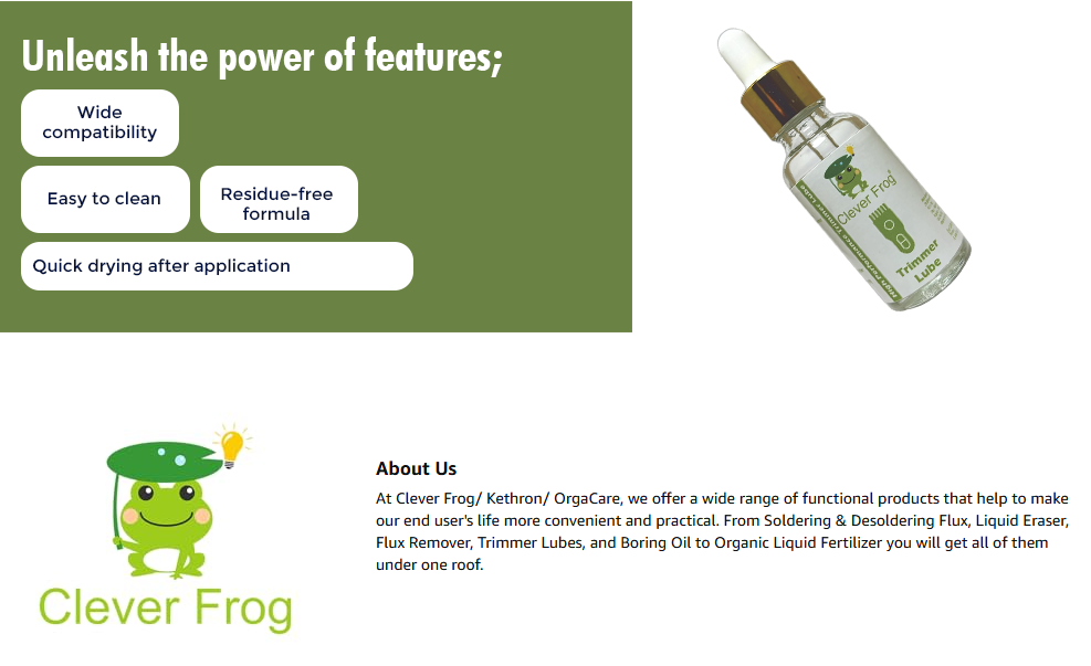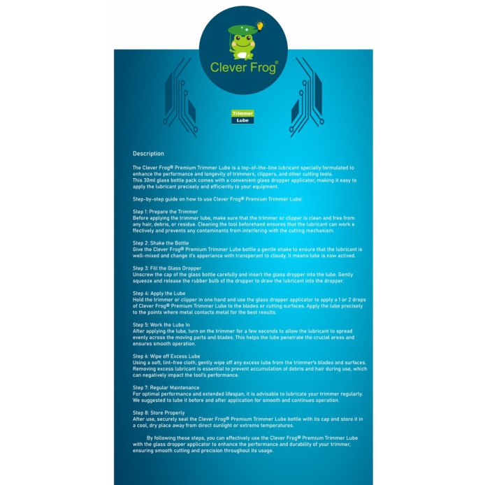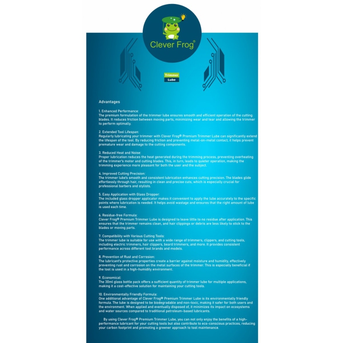 6. Residue-free Formula: Clever Frog Premium Trimmer Lube is designed to leave little to no residue after application. This ensures that the trimmer remains clean, and hair clippings or debris are less likely to stick to the blades or moving parts.