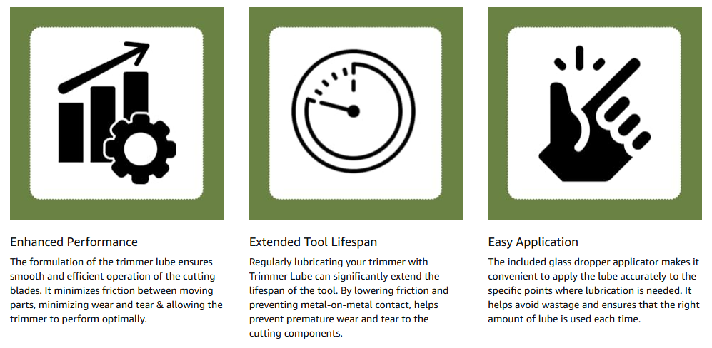 7. Compatibility with Various Cutting Tools: The trimmer lube is suitable for use with a wide range of trimmers, clippers, and cutting tools, including electric trimmers, hair clippers, beard trimmers, and more. It provides consistent performance across different tool brands and models.